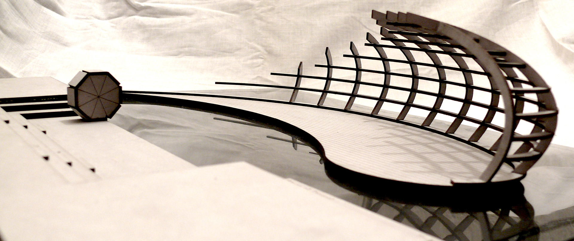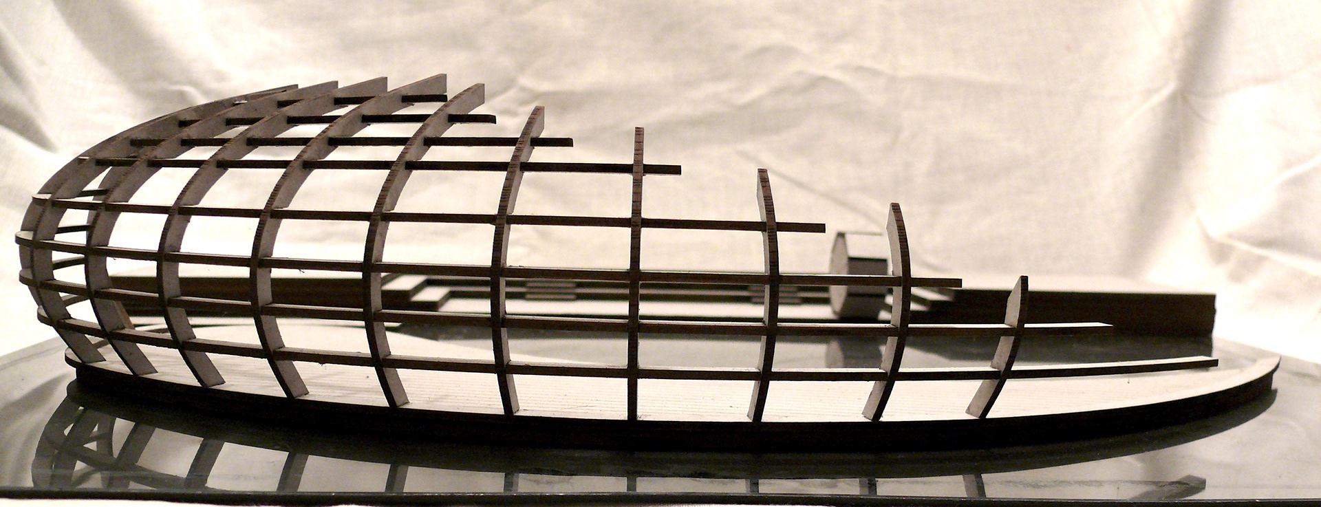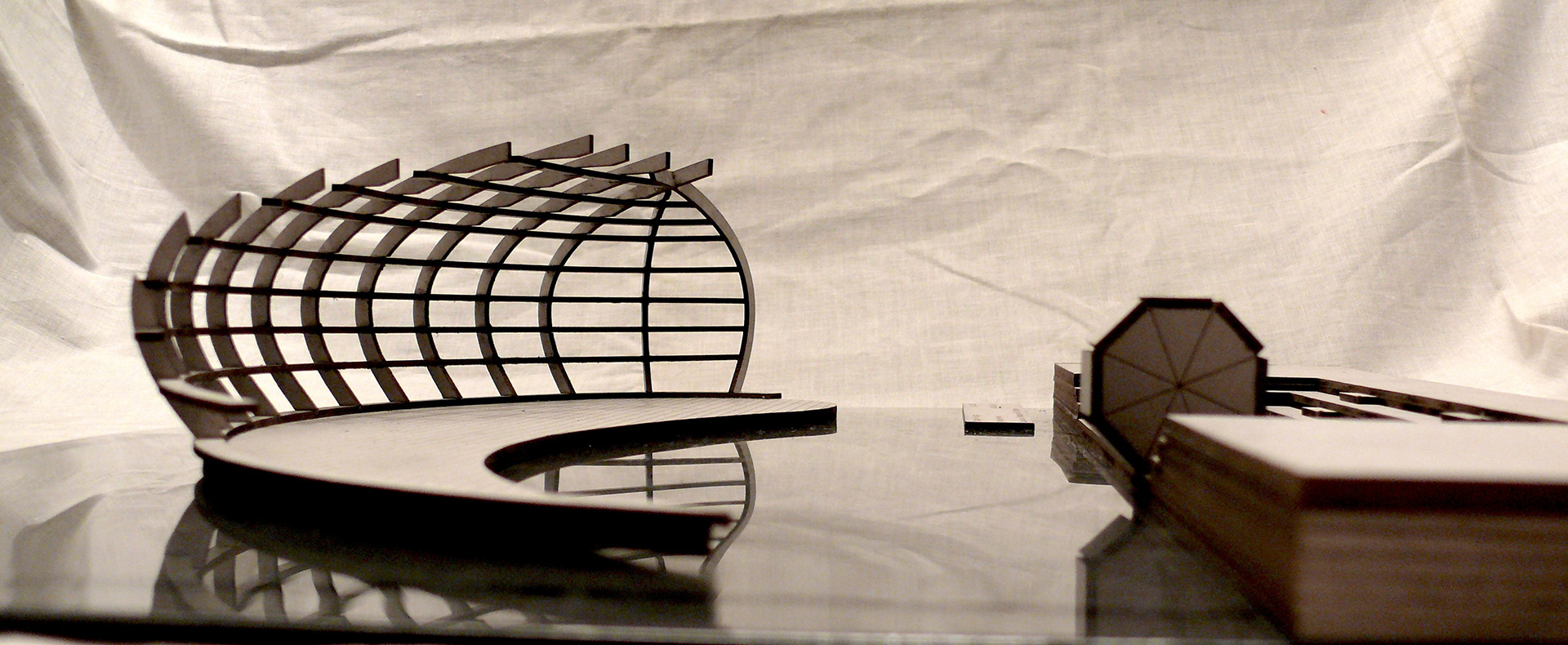 "Stage of Change" is ambitious project, which main inspiration is autumn leaf. It represents cycle of year, with its continuous change and repetition of the past. In the same way this stage is meant for change. When fabric is pulled over the timber structure, it can be used for free time activities as theatre, concerts and other performances. Everyday use for the stage represents more settle and relaxing atmosphere. When the roll out bridge is open for public, one may enjoy weather on the water with friends and family. Organic shape of the structure represents Limfjord's natural beauty, framing surroundings into small, artistic windows. Main structure is created from timber, similarly as the ship, though part under the water is filled with used water bottles in several layers. They are located in smaller departments to stabilise and tied together for solid performance.