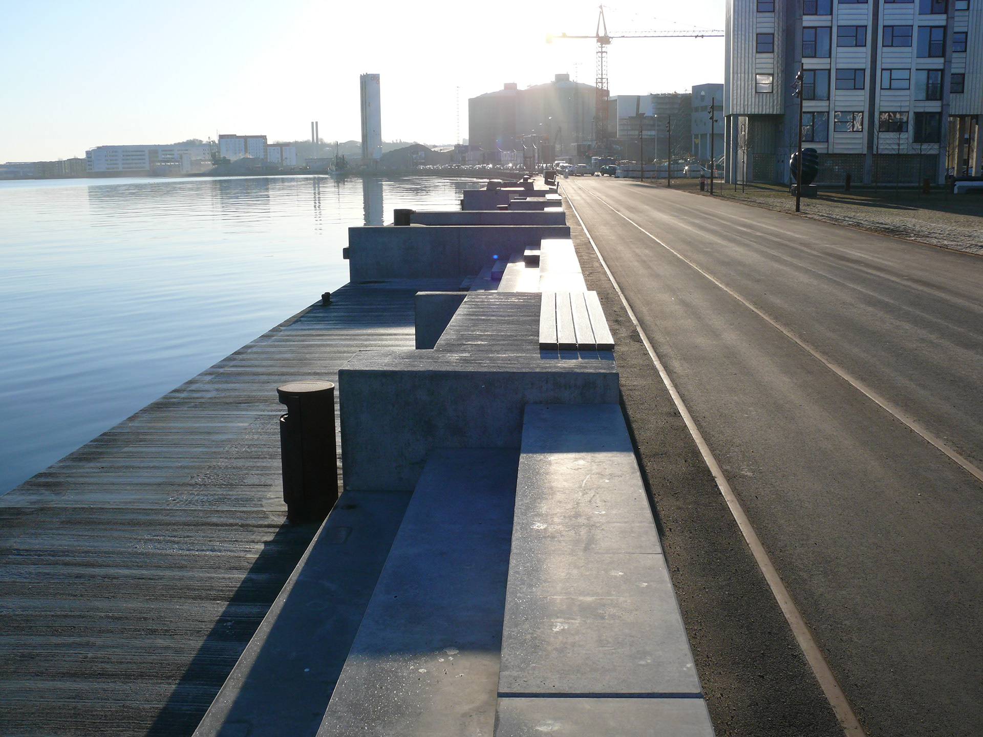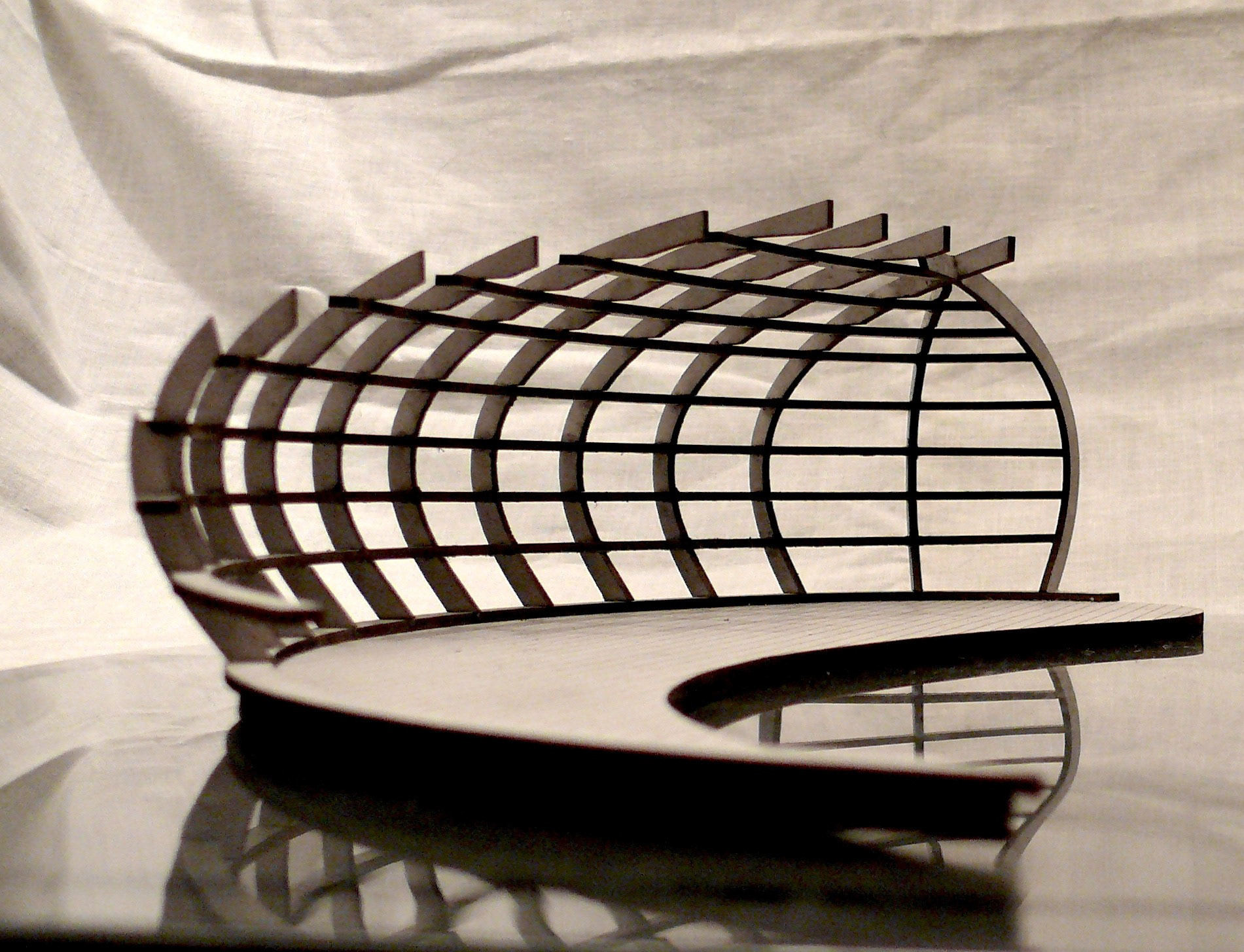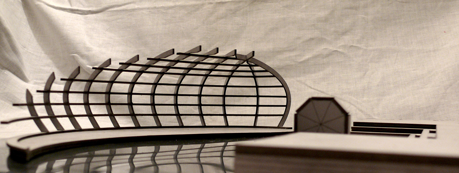 "Stage of Change" is ambitious project, which main inspiration is autumn leaf. It represents cycle of year, with its continuous change and repetition of the past. In the same way this stage is meant for change. When fabric is pulled over the timber structure, it can be used for free time activities as theatre, concerts and other performances. Everyday use for the stage represents more settle and relaxing atmosphere. When the roll out bridge is open for public, one may enjoy weather on the water with friends and family. Organic shape of the structure represents Limfjord's natural beauty, framing surroundings into small, artistic windows. Main structure is created from timber, similarly as the ship, though part under the water is filled with used water bottles in several layers. They are located in smaller departments to stabilise and tied together for solid performance.